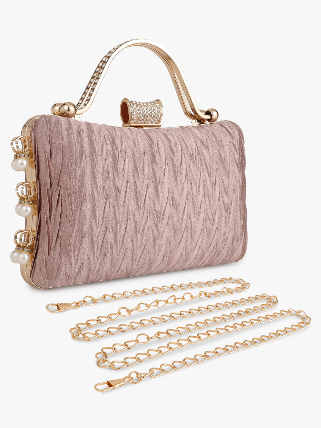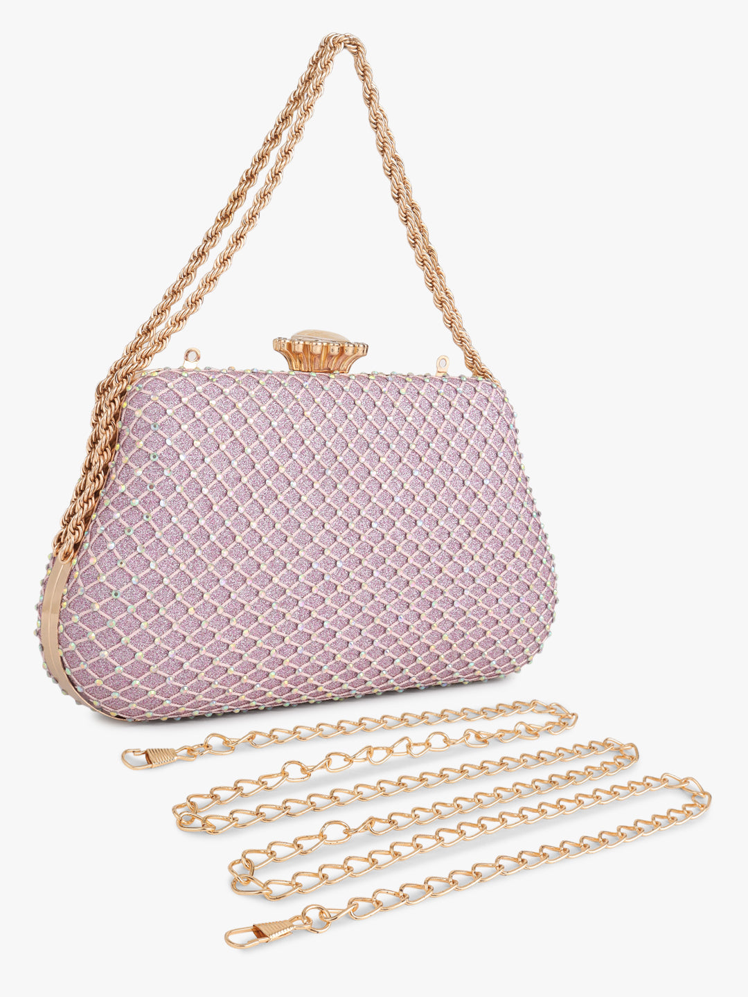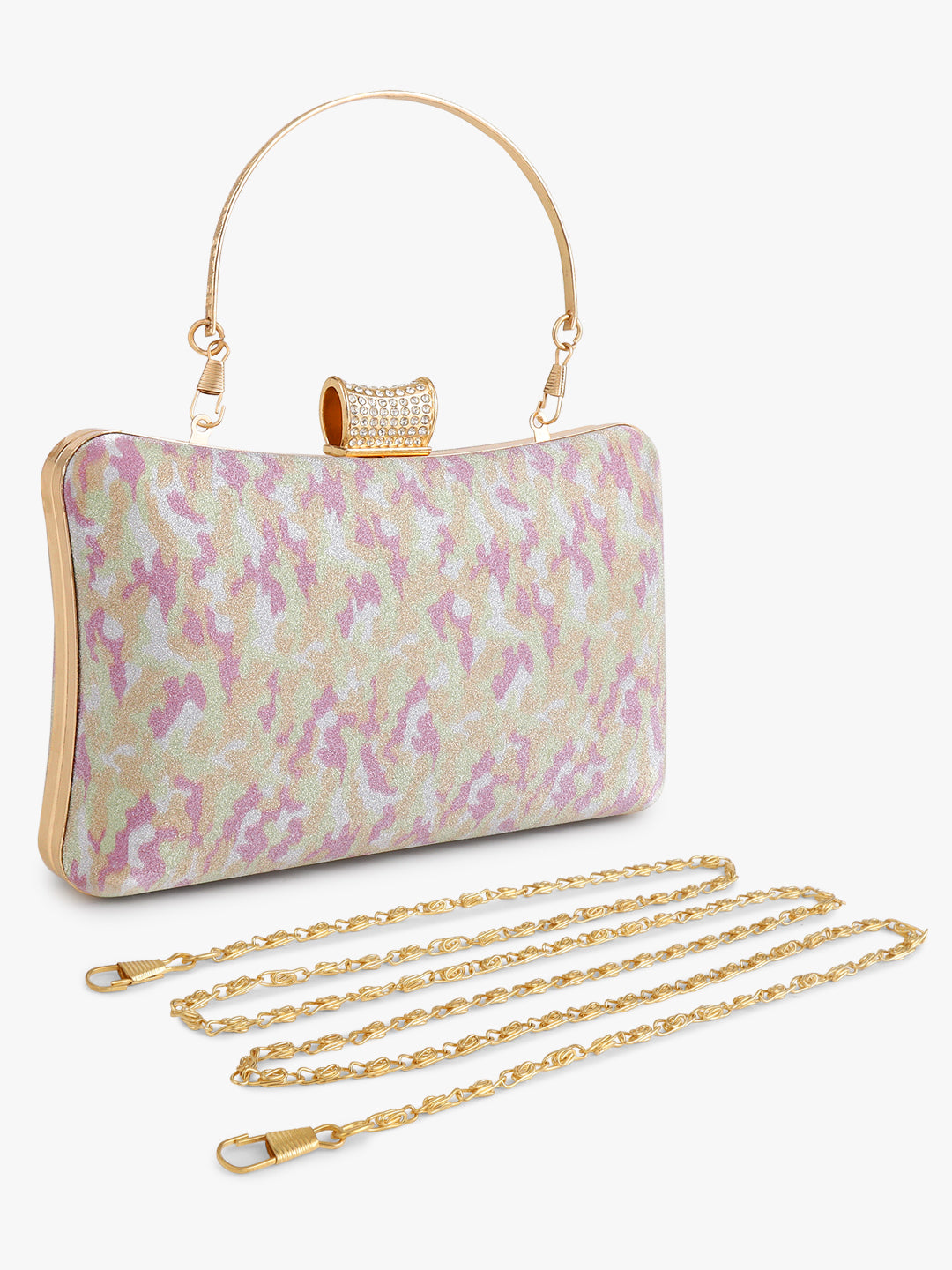 Elegant pastel shimmer clutch with abstract pink and gold design, crystal-studded clasp, and detachable chain...