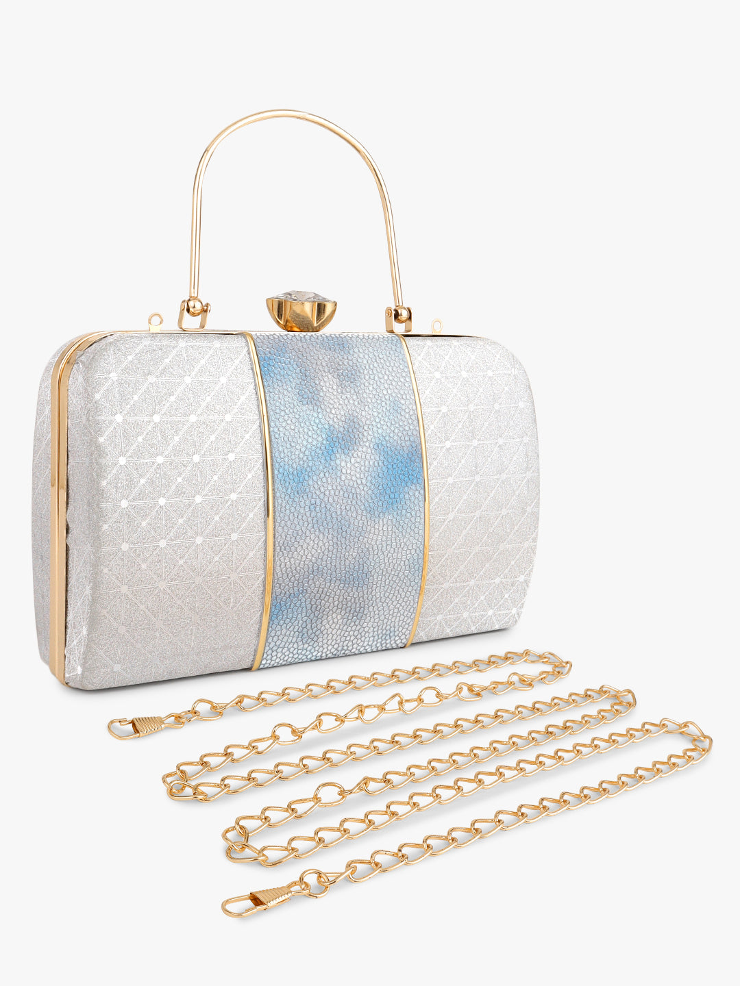 Shine in subtle sophistication with this pastel shimmer clutch, featuring a dreamy blue-green accent panel...
