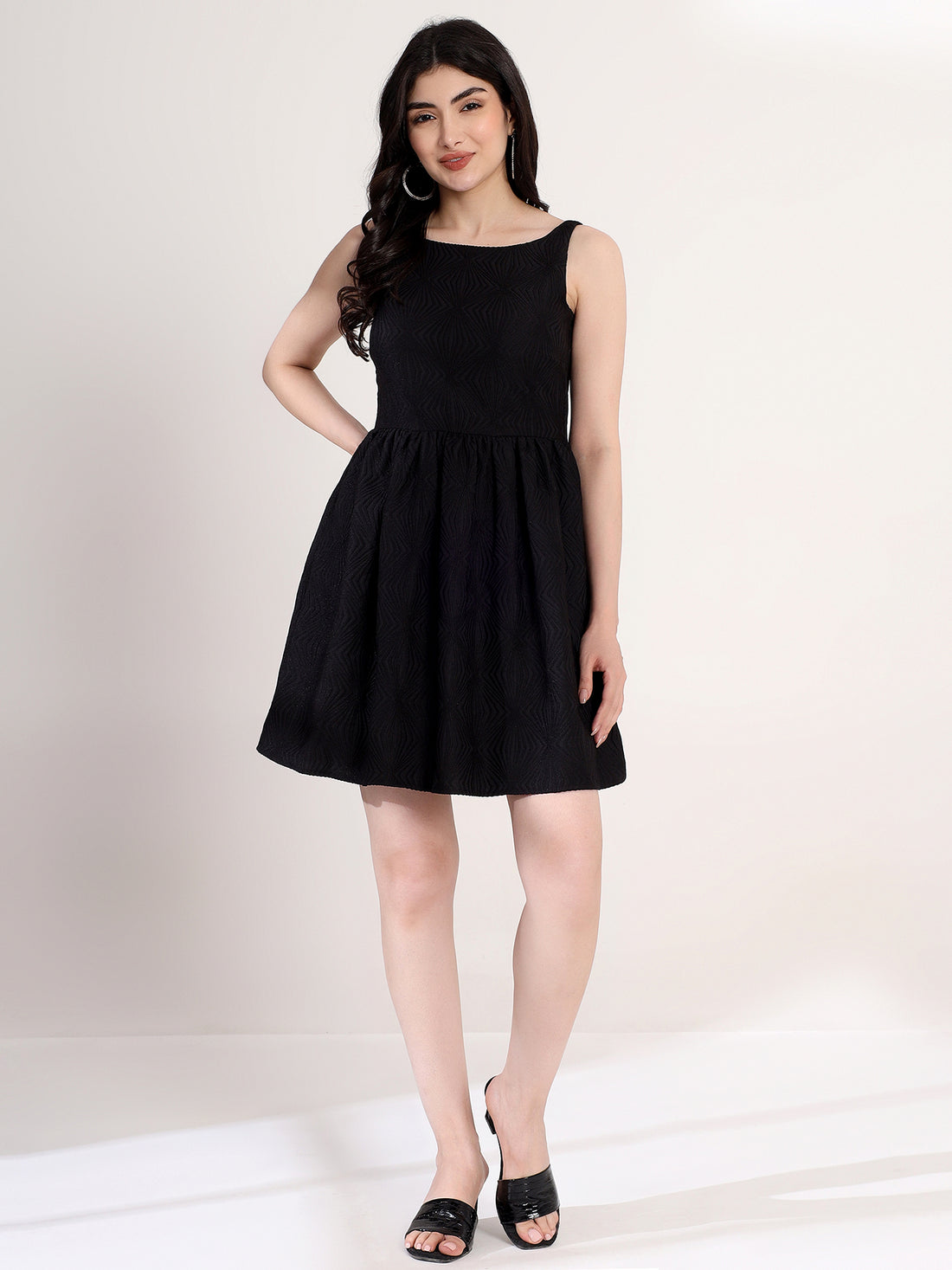 A classic sleeveless black fit & flare dress with subtle textured detailing, perfect for parties...