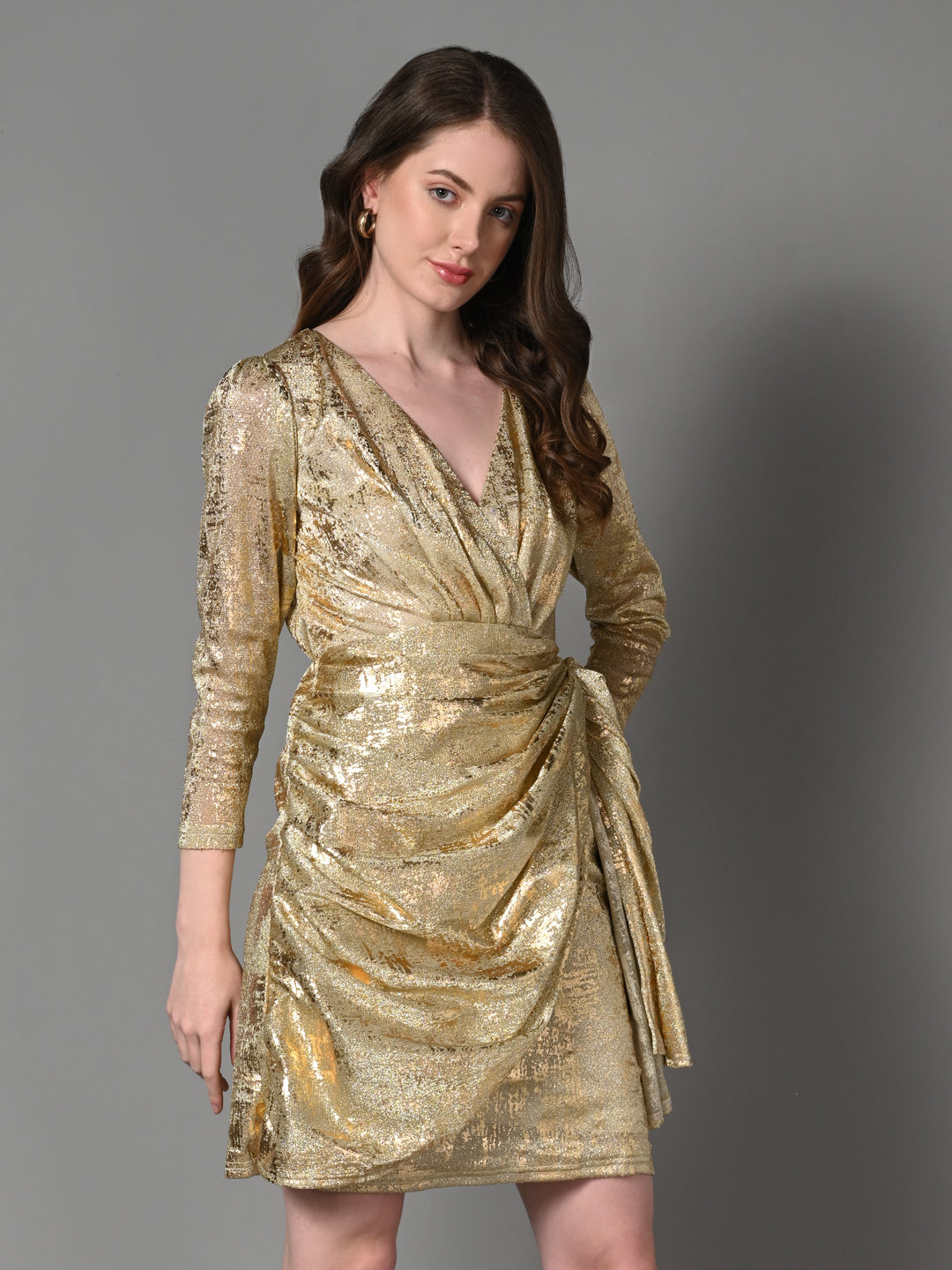 A glamorous gold metallic wrap dress with structured draping, ideal for high-impact evening wear. Product...