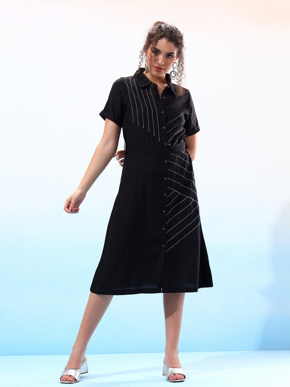 This black button-down midi dress with modern pinstripe detailing and a structured collar brings together...