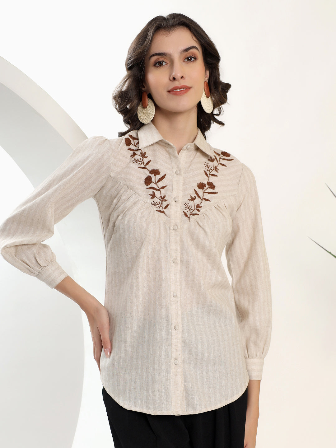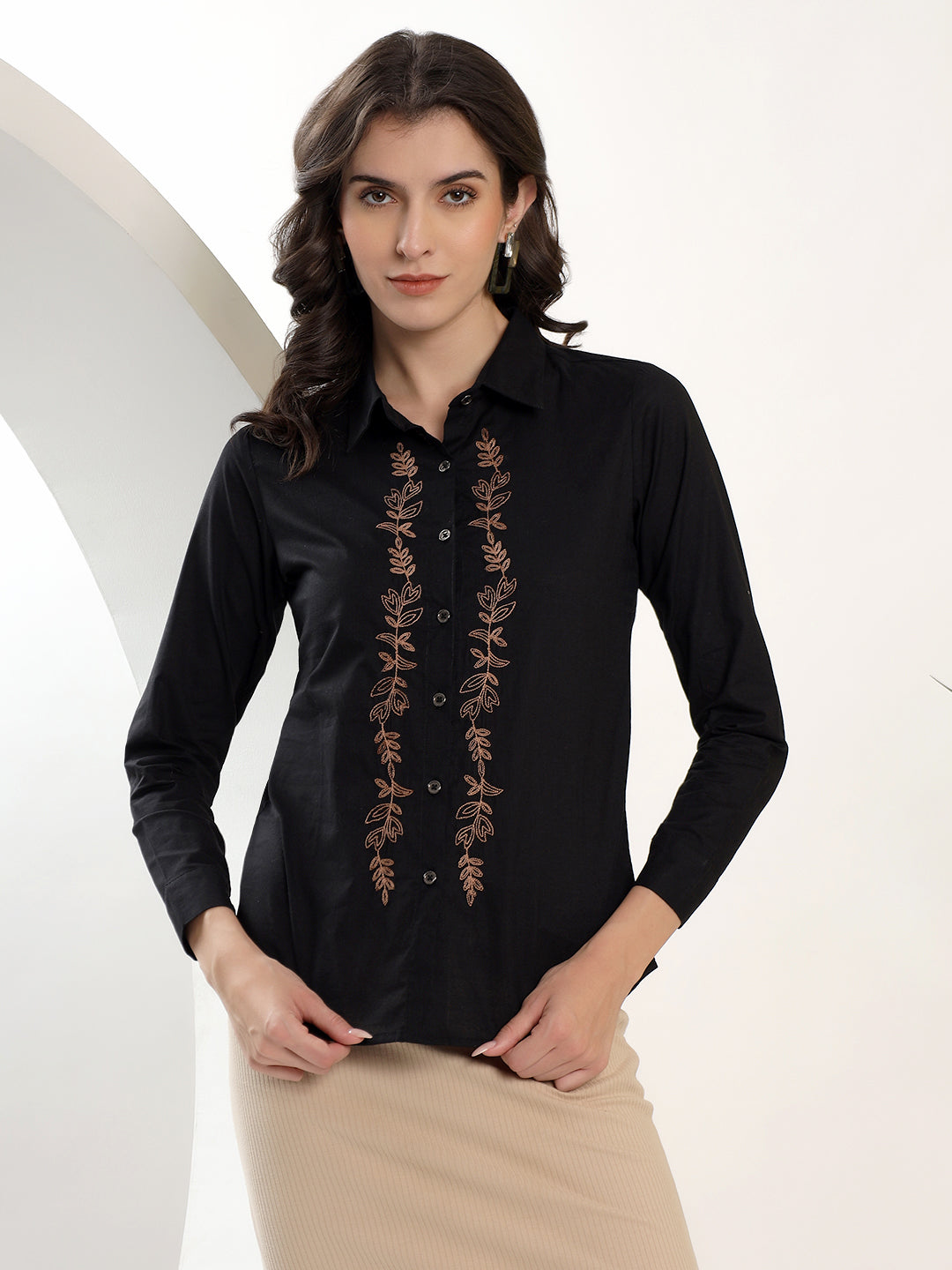 These black button-down top features elegant brown floral embroidery and a classic shirt collar. Made...