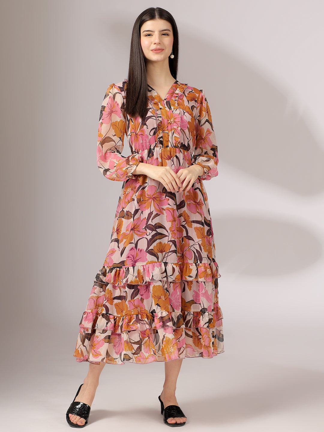 A vibrant floral midi dress with ruffle details and a flowy silhouette, perfect for daytime...