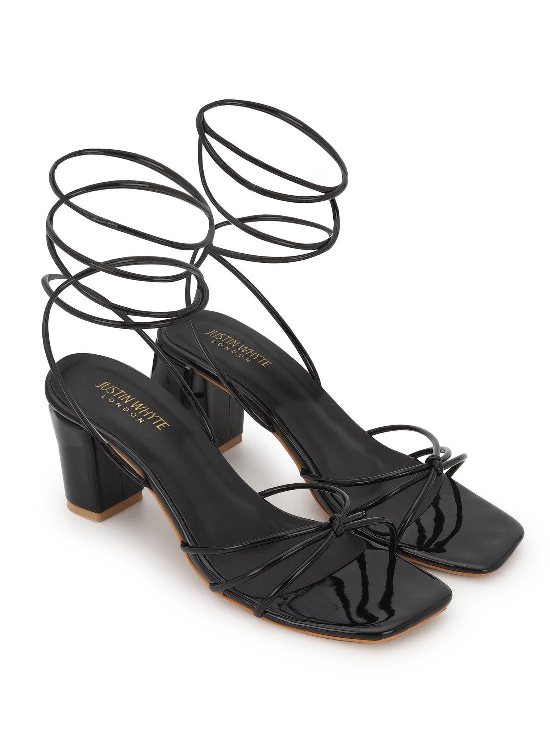Elevate your evening look with these glossy black lace-up heels. Featuring a sleek square toe,...