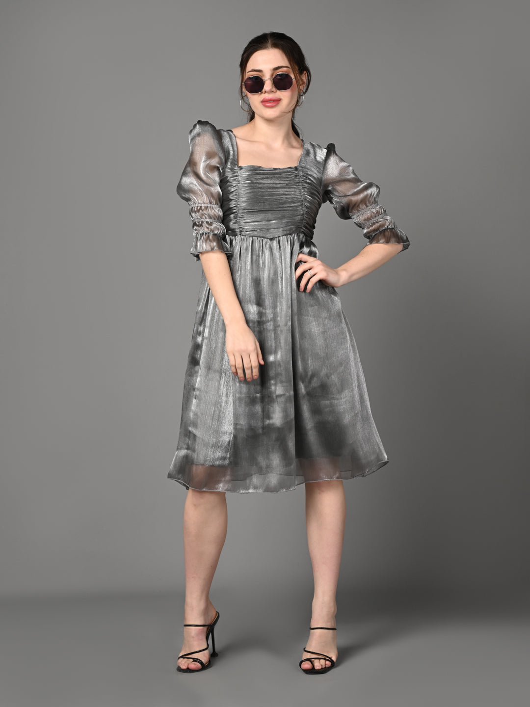 Make a sparkling statement in this silver metallic ruched dress, blending vintage glam and contemporary...
