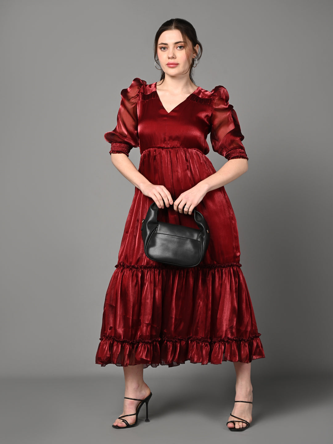 Step into timeless elegance with this wine-red Satin dress, complete with romantic puff sleeves and...