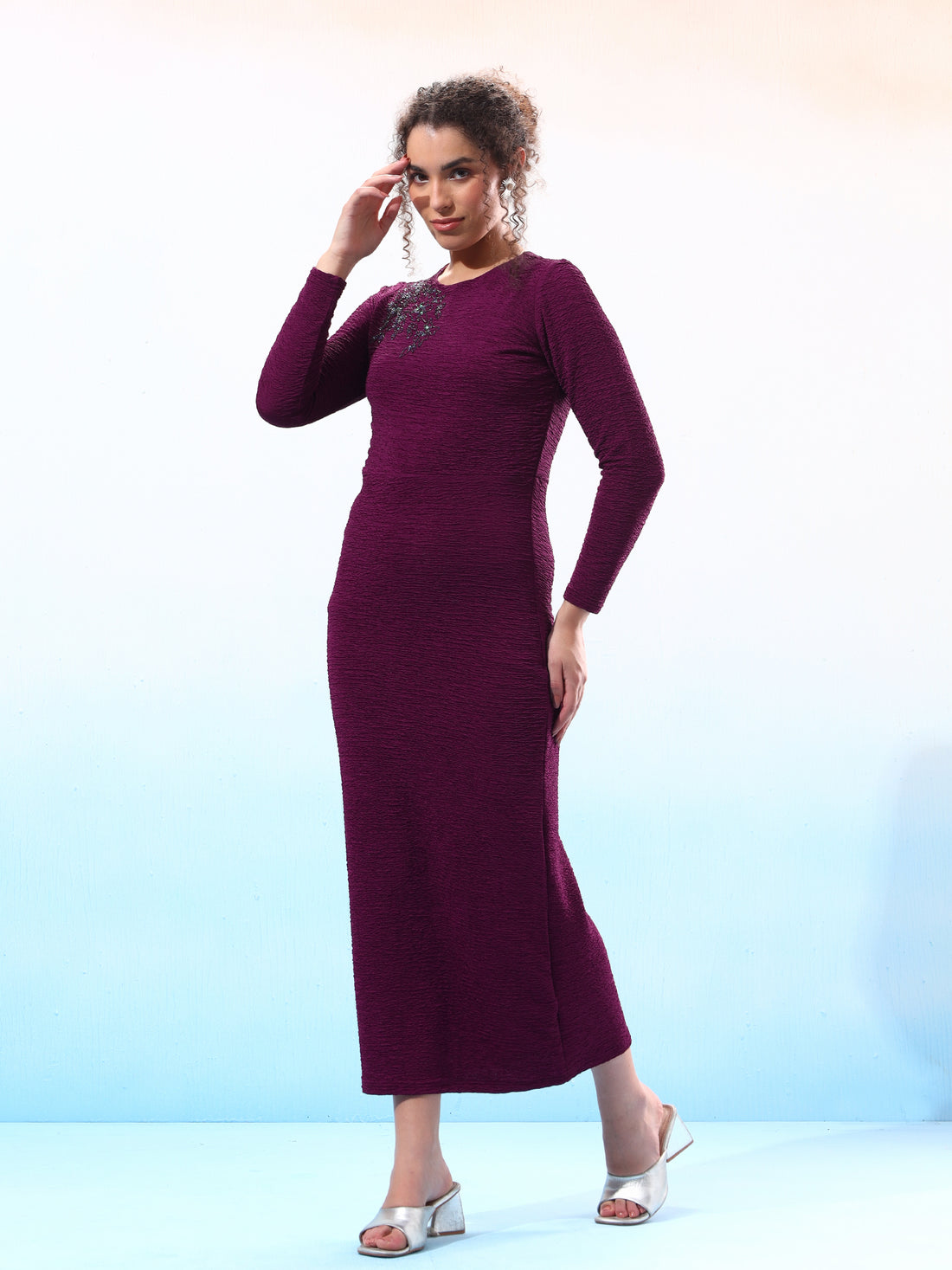 Grace meets elegance in this plum textured midi dress, complete with full sleeves and delicate...