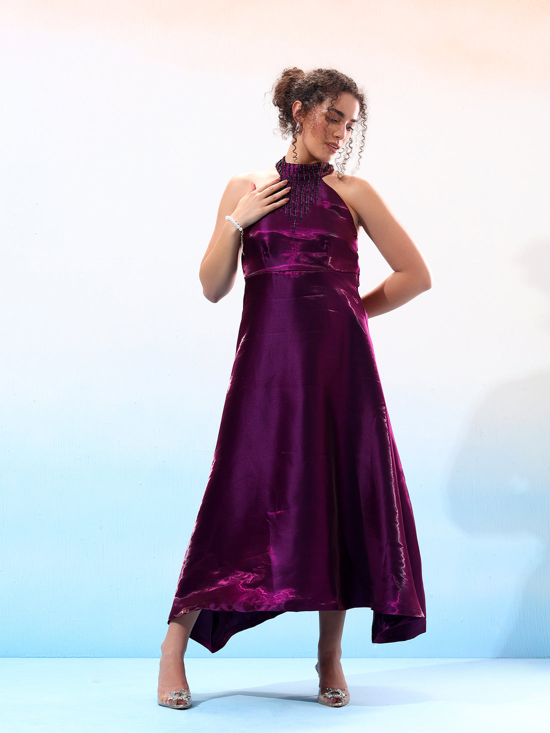 Elevate your evening look with this elegant purple satin dress featuring a high embellished halter...