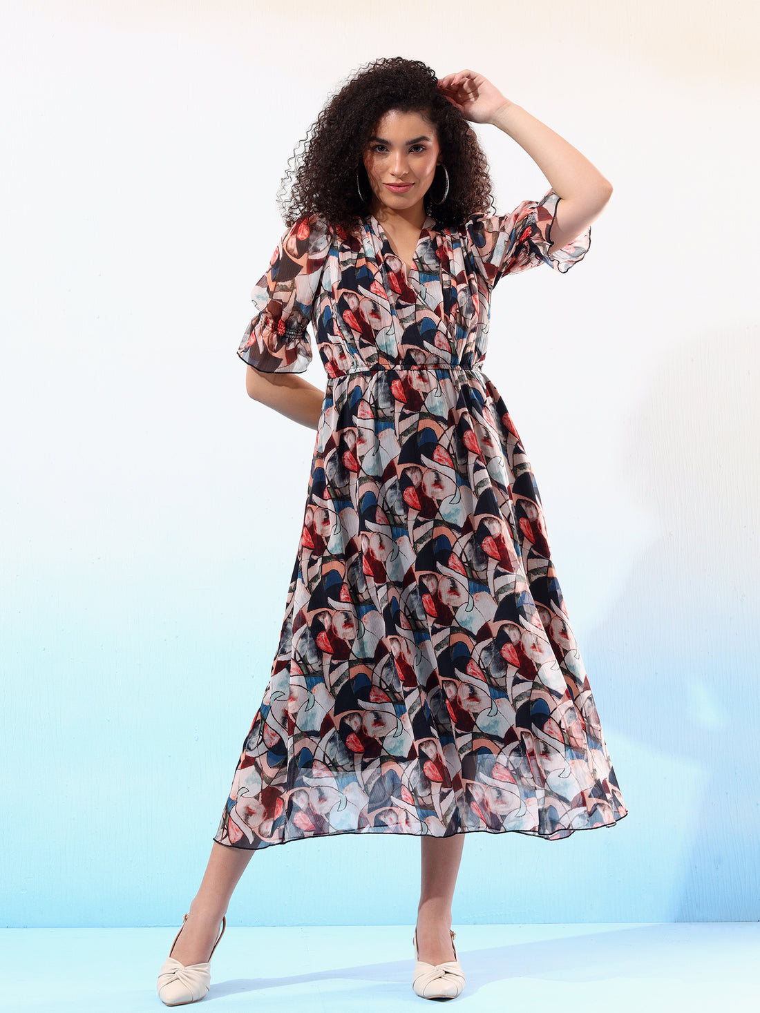 Effortlessly chic and playful, this printed georgette dress brings a splash of artistry to your...