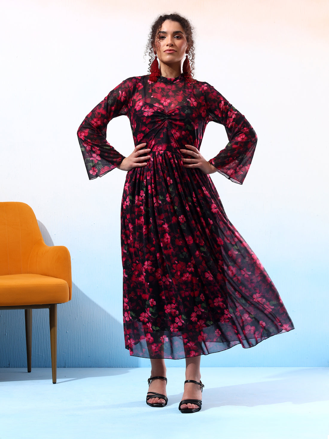 Make a graceful statement with this elegant black floral midi dress, featuring sheer bell sleeves,...