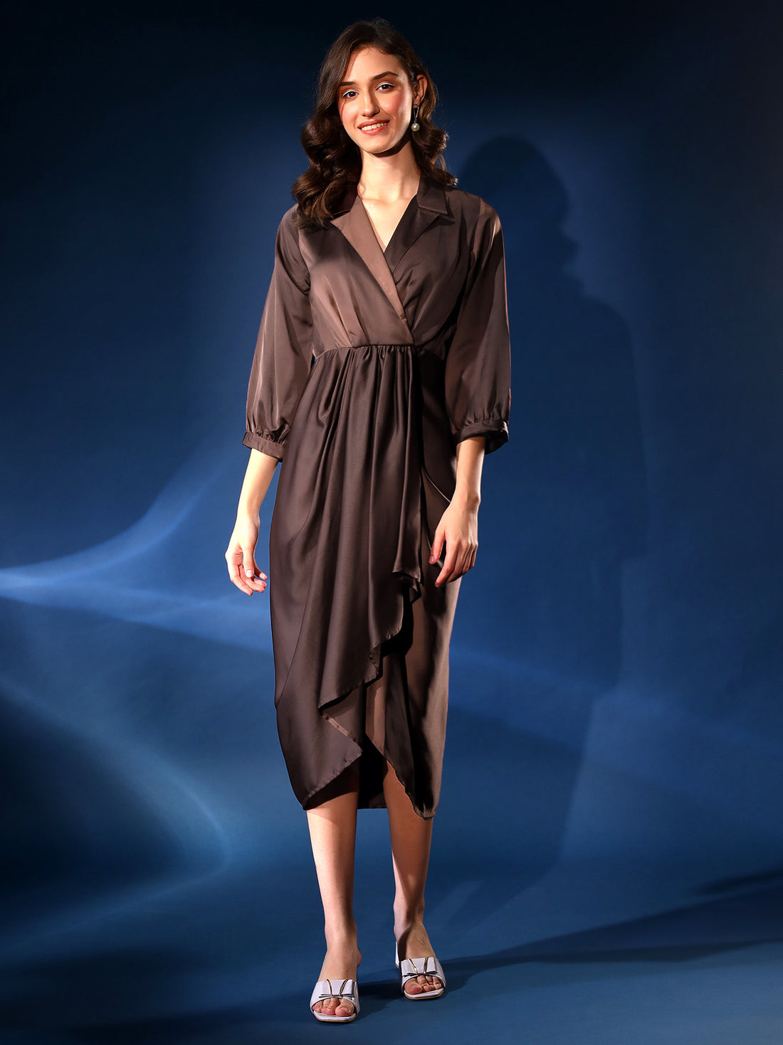 Gracefully tailored in glossy satin, this chocolate brown wrap dress with a collar and cascading...