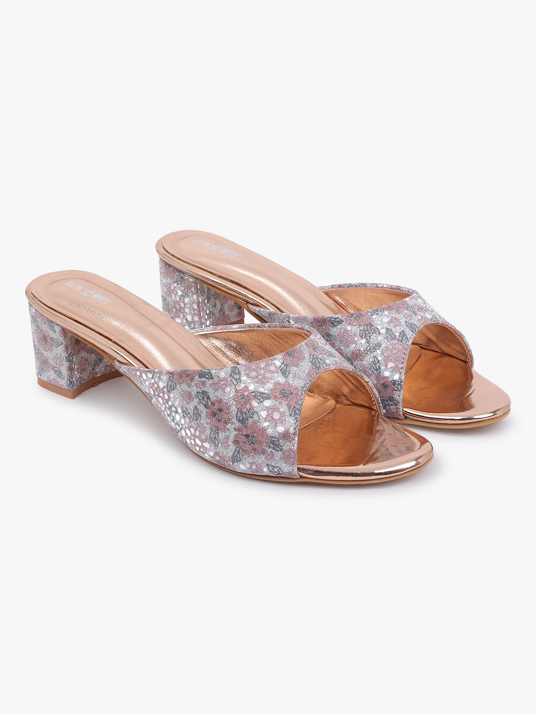 Chic floral shimmer block heels with metallic Gold accents — ideal for elevating festive and...