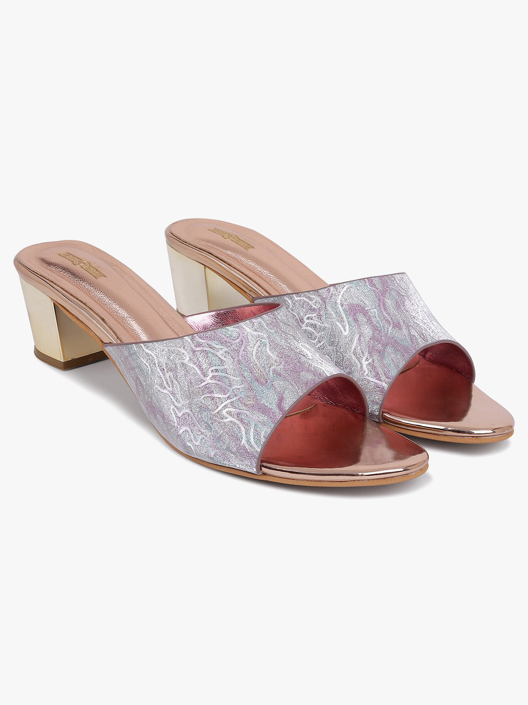 Chic metallic slip-on heels with a soft pink and silver textured finish — designed for...