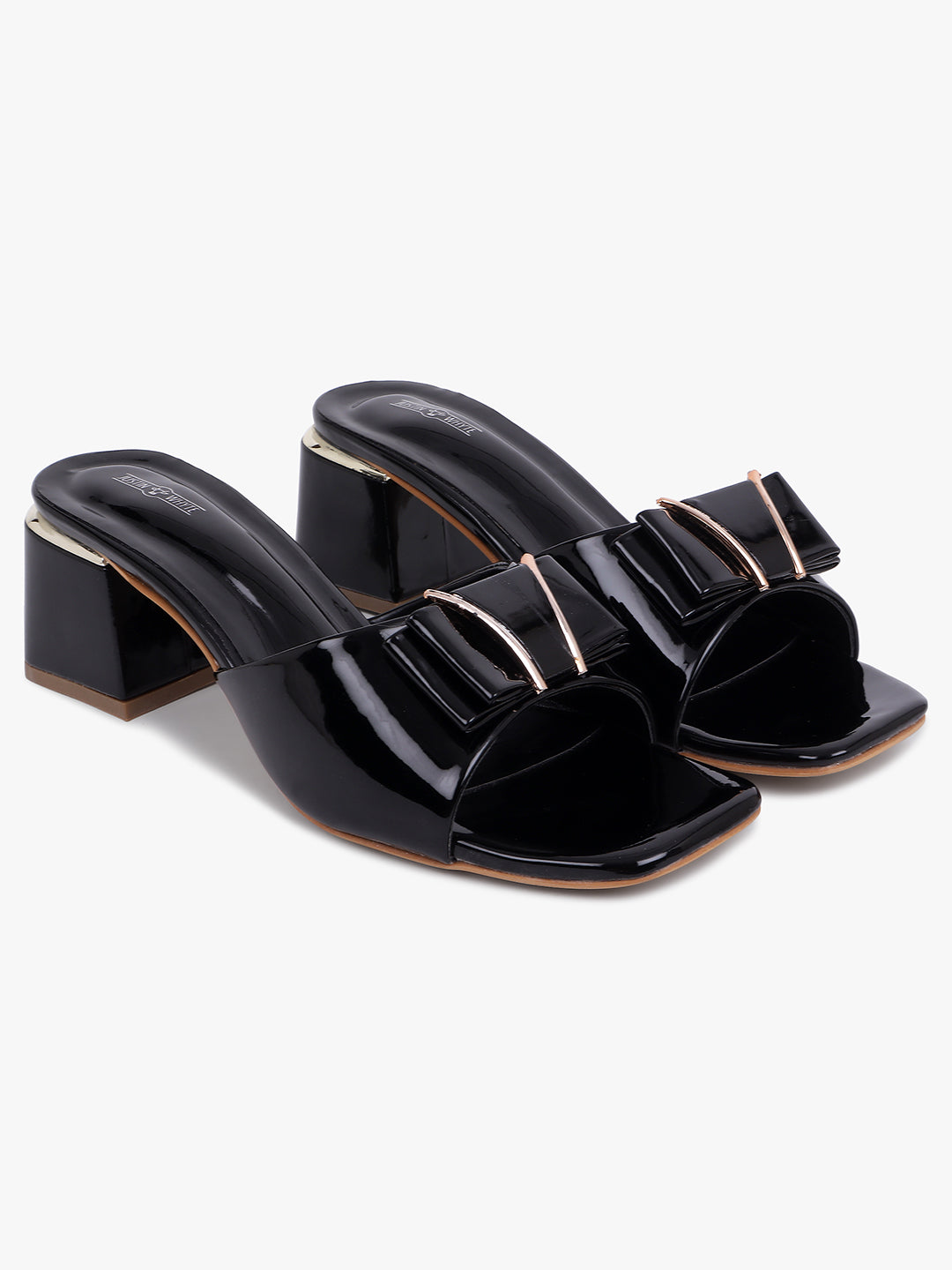 Glossy Black closed-toe sandals featuring a chic bow embellishment and a sturdy block heel —...