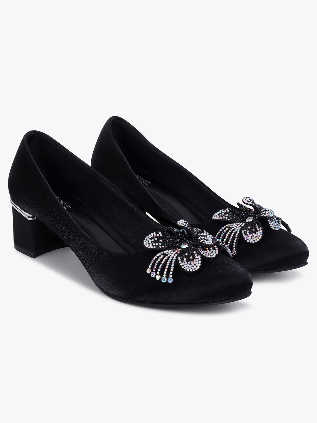 Add a touch of sparkle to your look with these elegant black block heels, adorned...