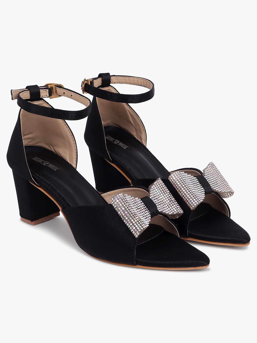 Elegant black ankle-strap sandals with embellished bow detail, adding a graceful charm to your festive...