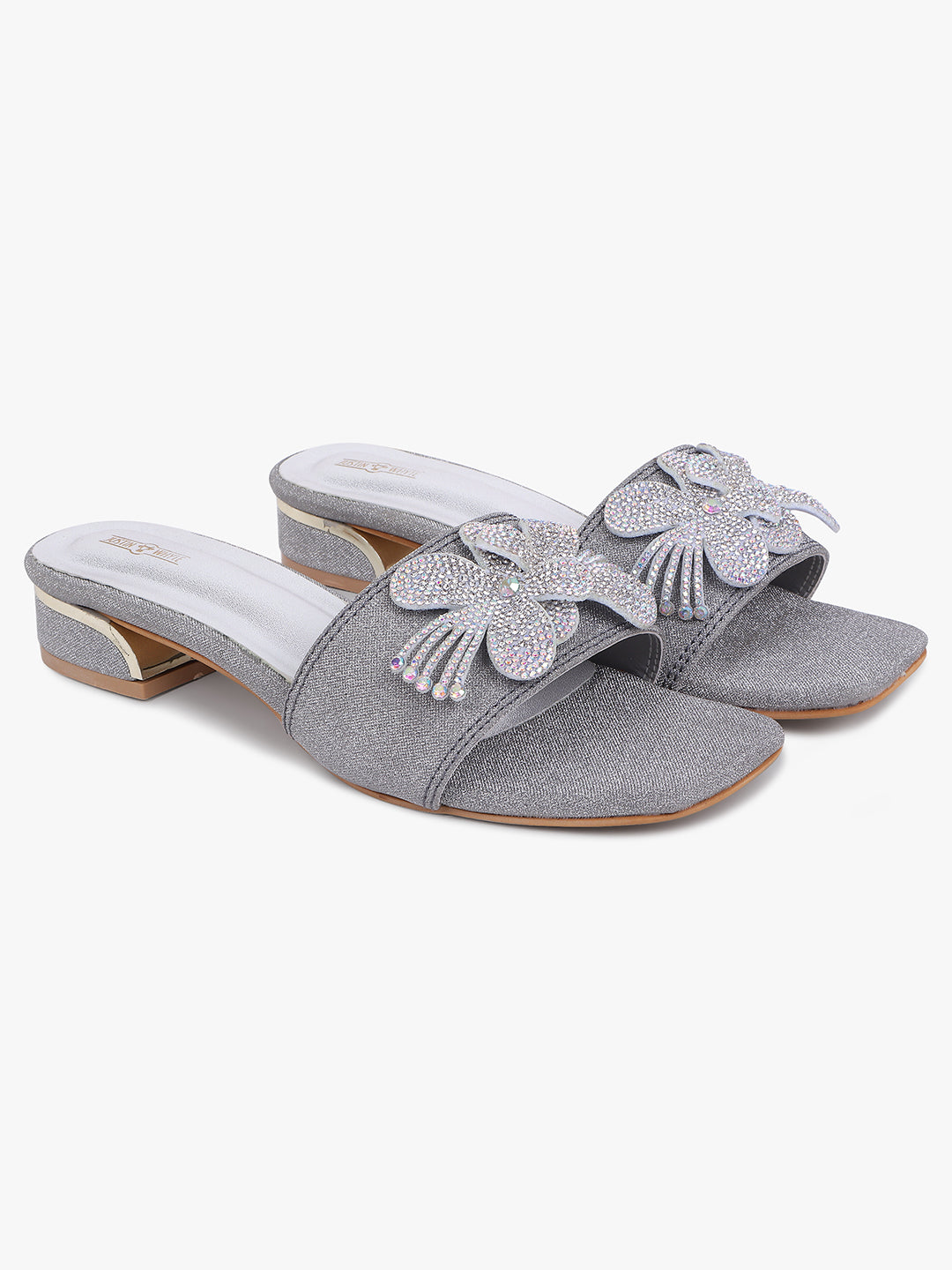 Elegant Silver shimmer slip-ons with dazzling floral embellishments, designed to add sparkle to your party...