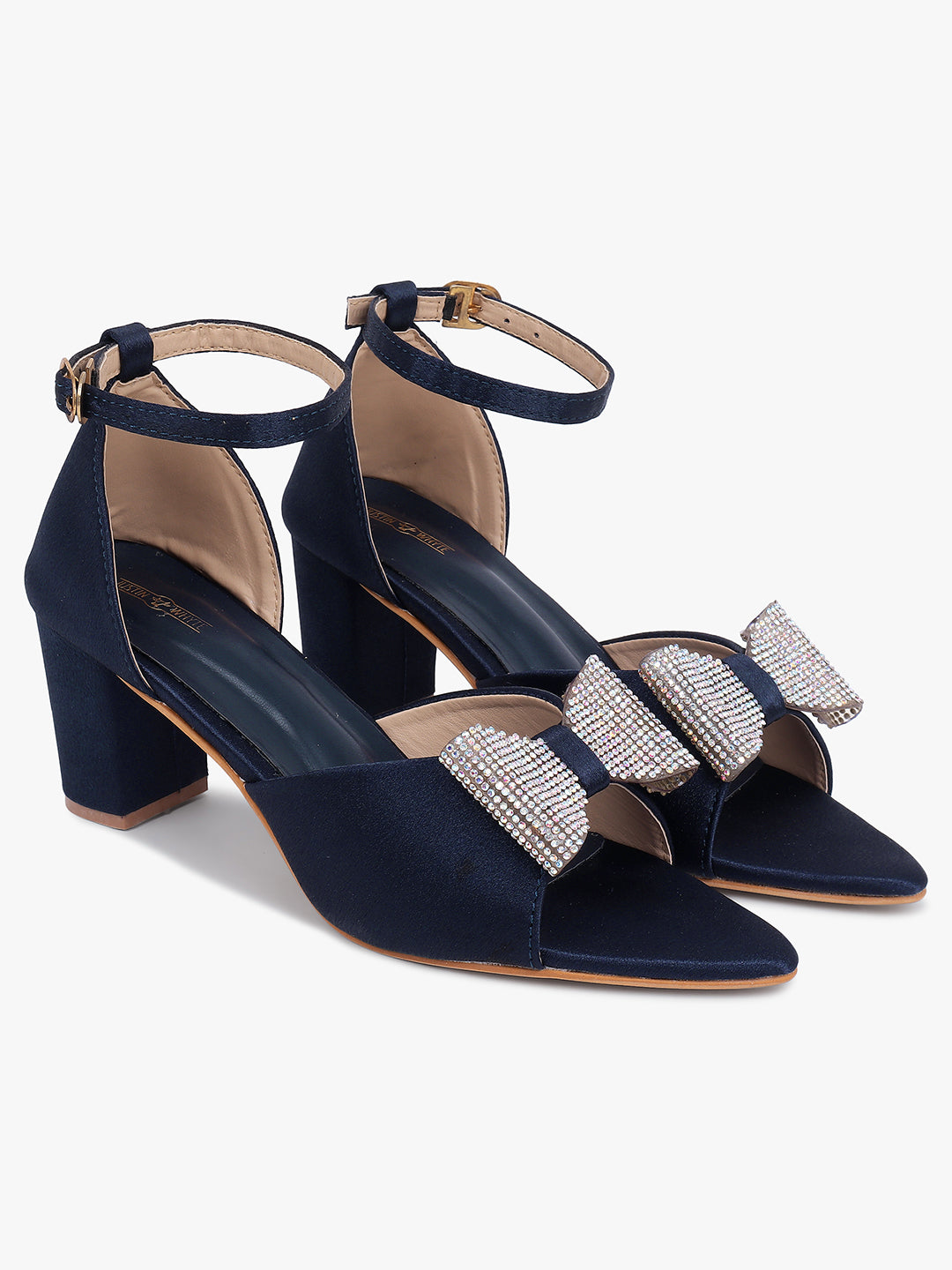 Elegant blue ankle-strap sandals with embellished bow detail, adding a graceful charm to your festive...