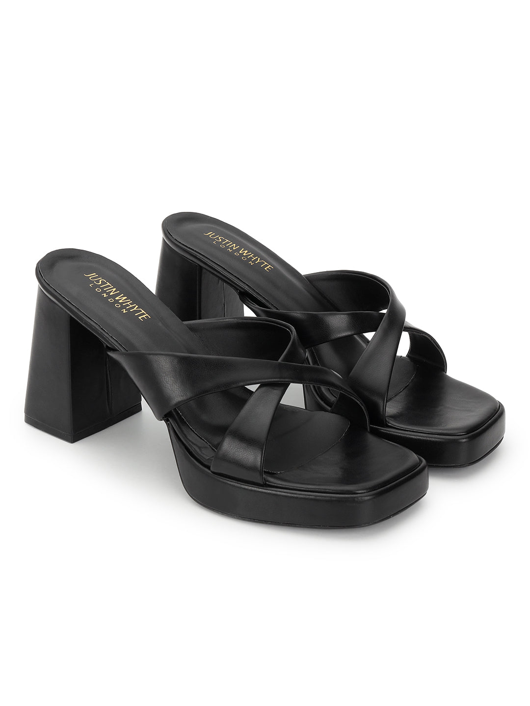 Step up your style game with these sleek black heeled mules. Featuring wide crisscross straps...