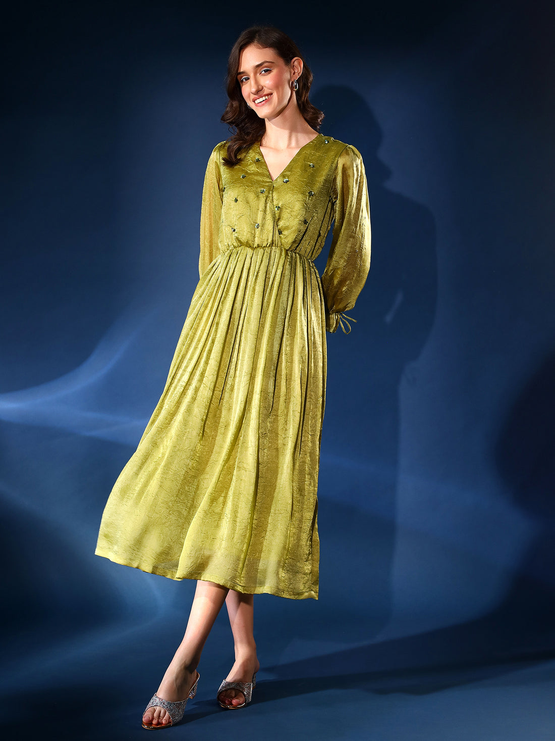 Turn heads in this olive satin wrap-style midi dress featuring a ruched waist, front slit,...