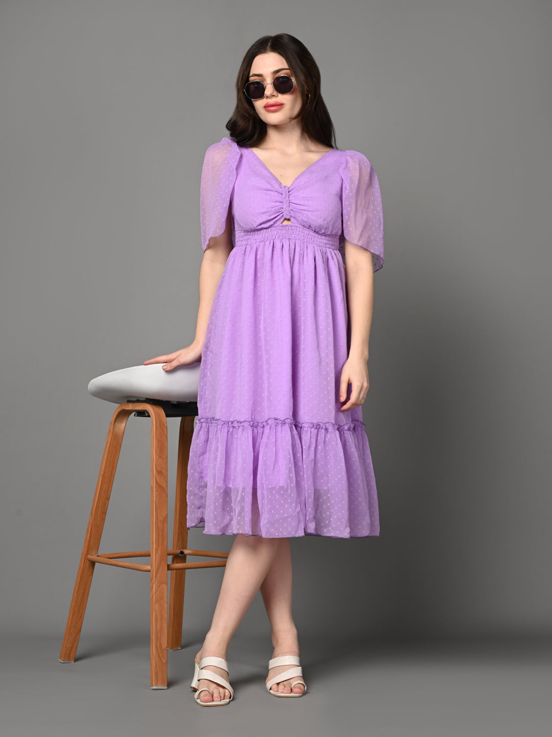 This charming lavender midi dress features a sheer polka-dot overlay, delicate flutter sleeves, and ruched...