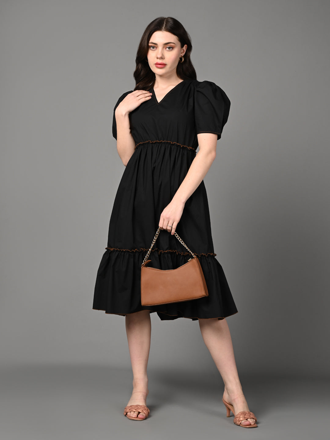 Effortlessly elegant, this black tiered cotton dress with puff sleeves and contrast stitching is the...