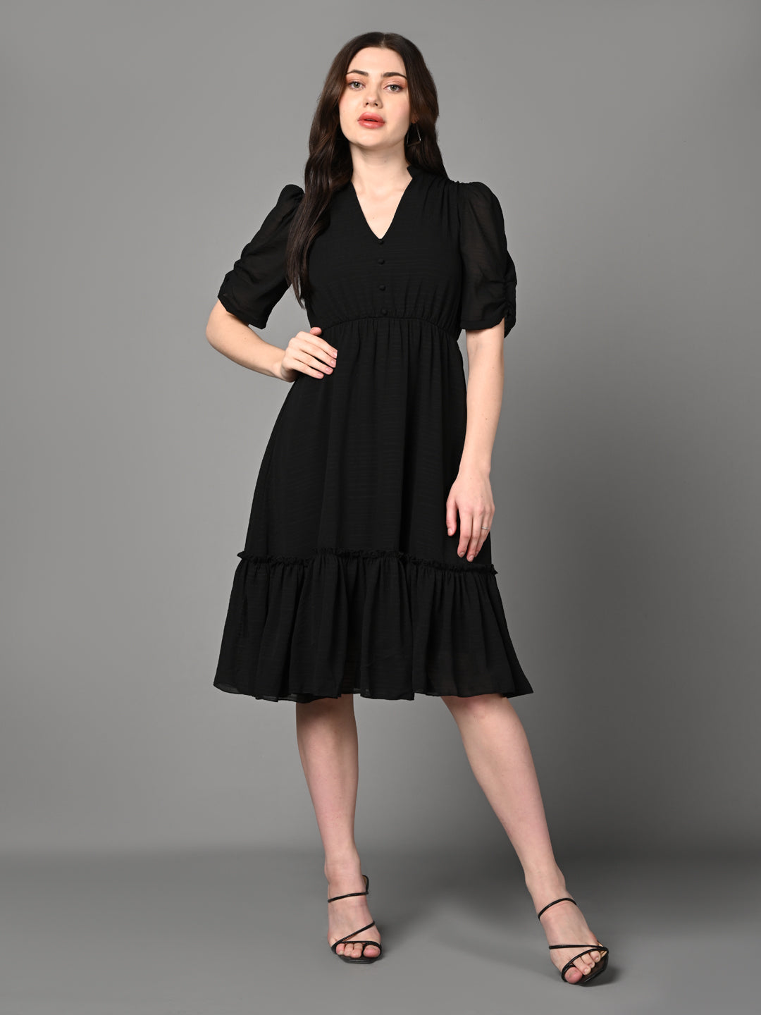 Elegant and timeless, this solid black dress features soft puff sleeves, a ruffled hem, and...