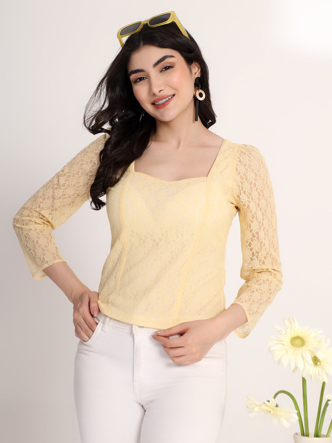 Add a fresh pop of charm to your wardrobe with this elegant yellow lace top,...