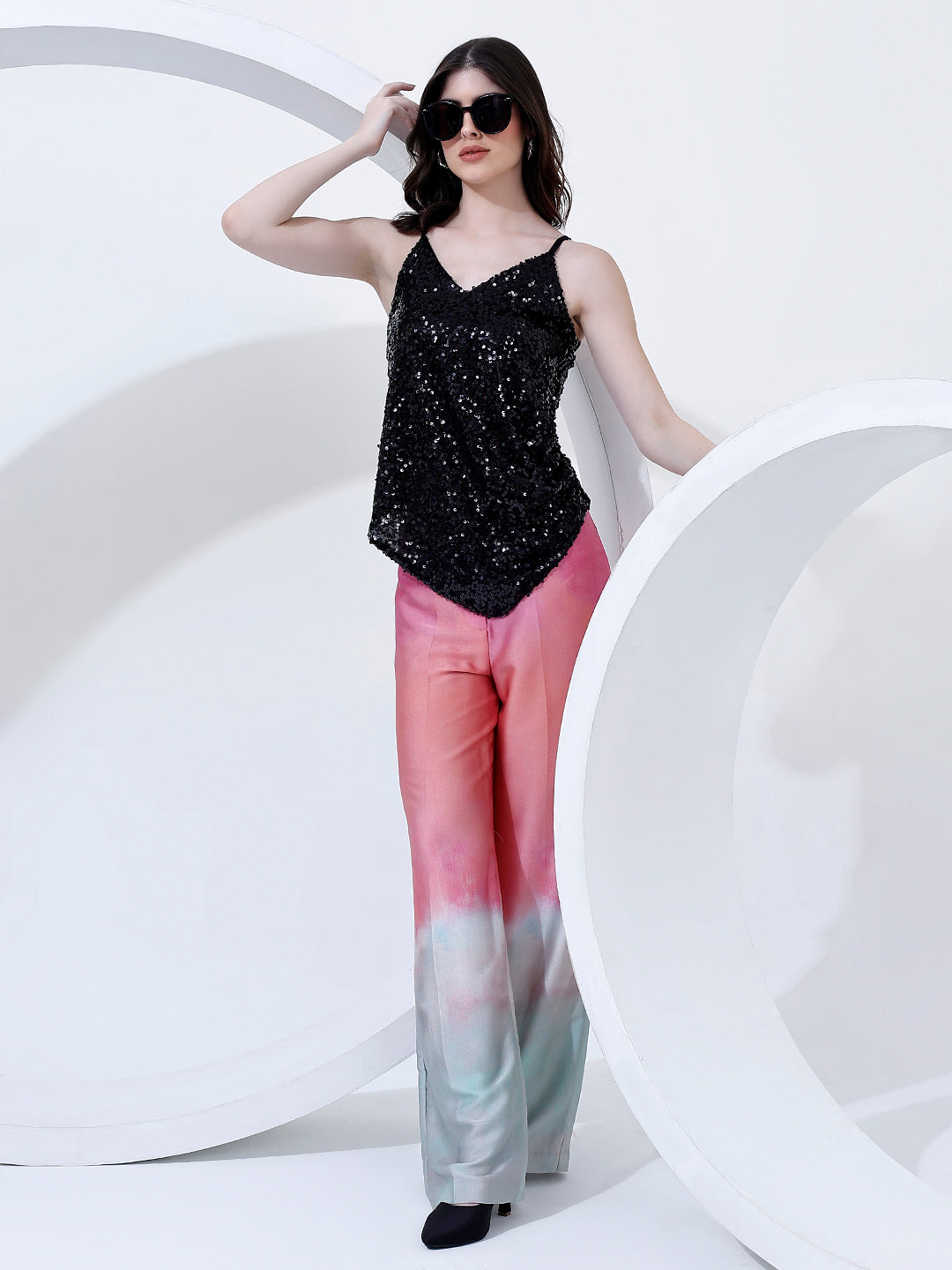 Shine bright in this black sequin camisole top, featuring a flattering V-neckline and adjustable spaghetti straps. Perfect for party nights and festive occasions, this statement piece pairs effortlessly with skirts or trousers for an elegant, eye-catching look.