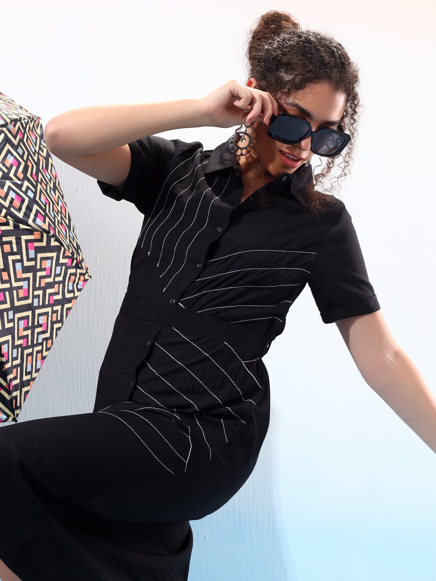 This black button-down midi dress with modern pinstripe detailing and a structured collar brings together timeless design and contemporary flair, perfect for desk-to-dinner wear.