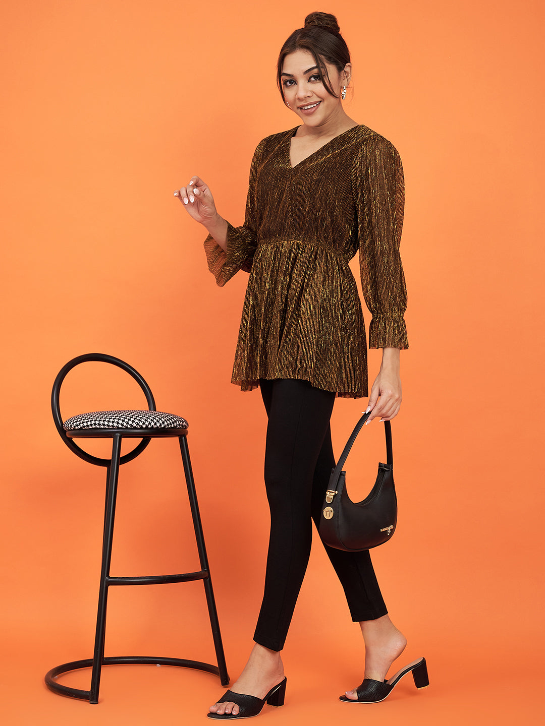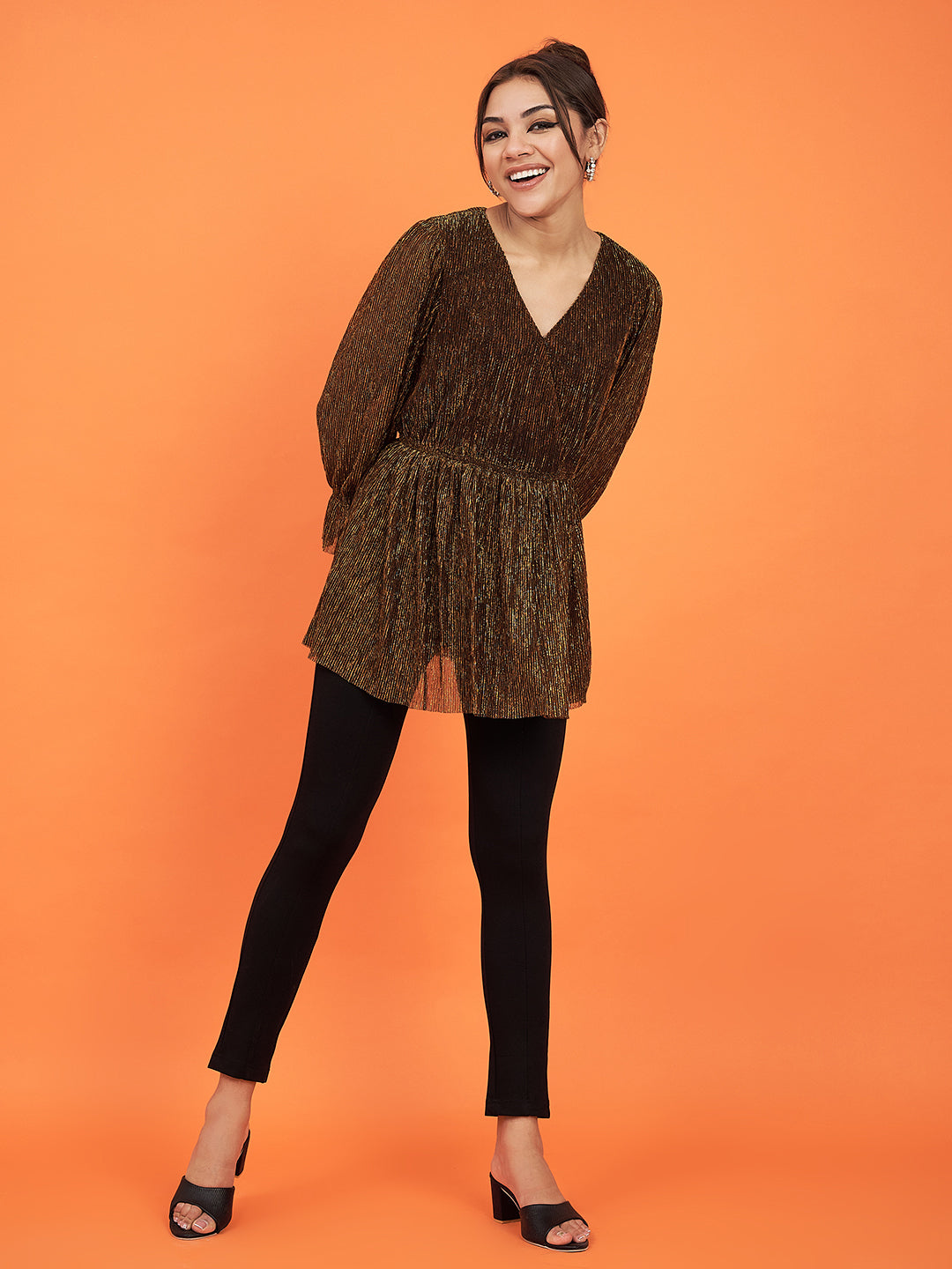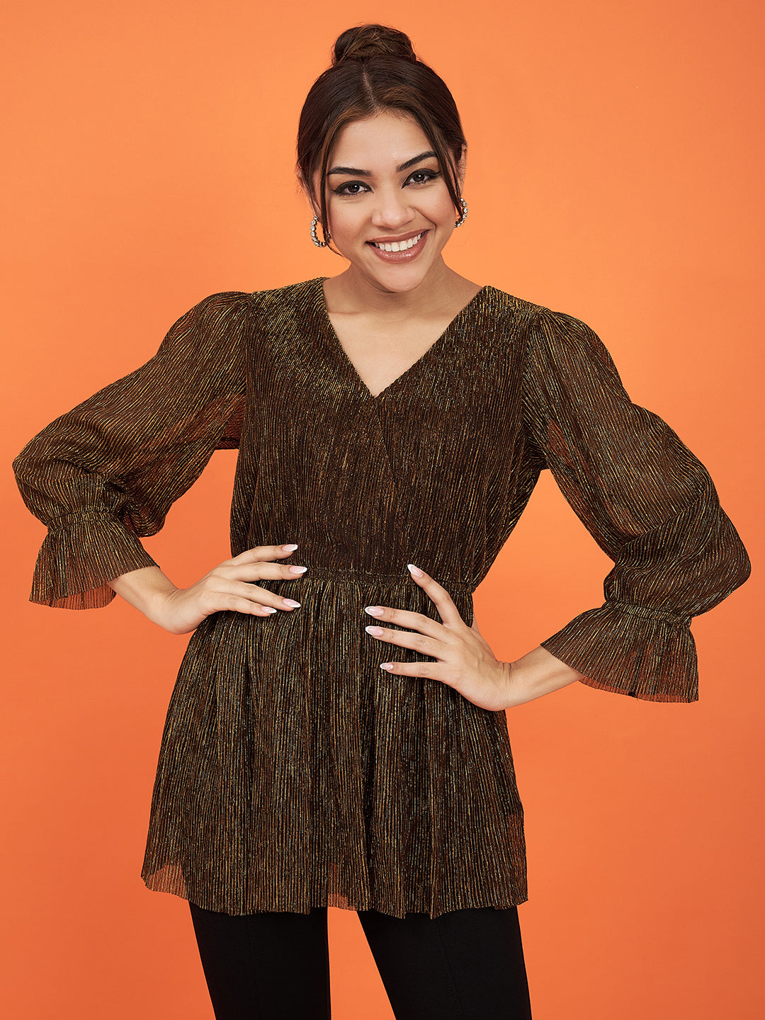 - Gold metallic pleated top