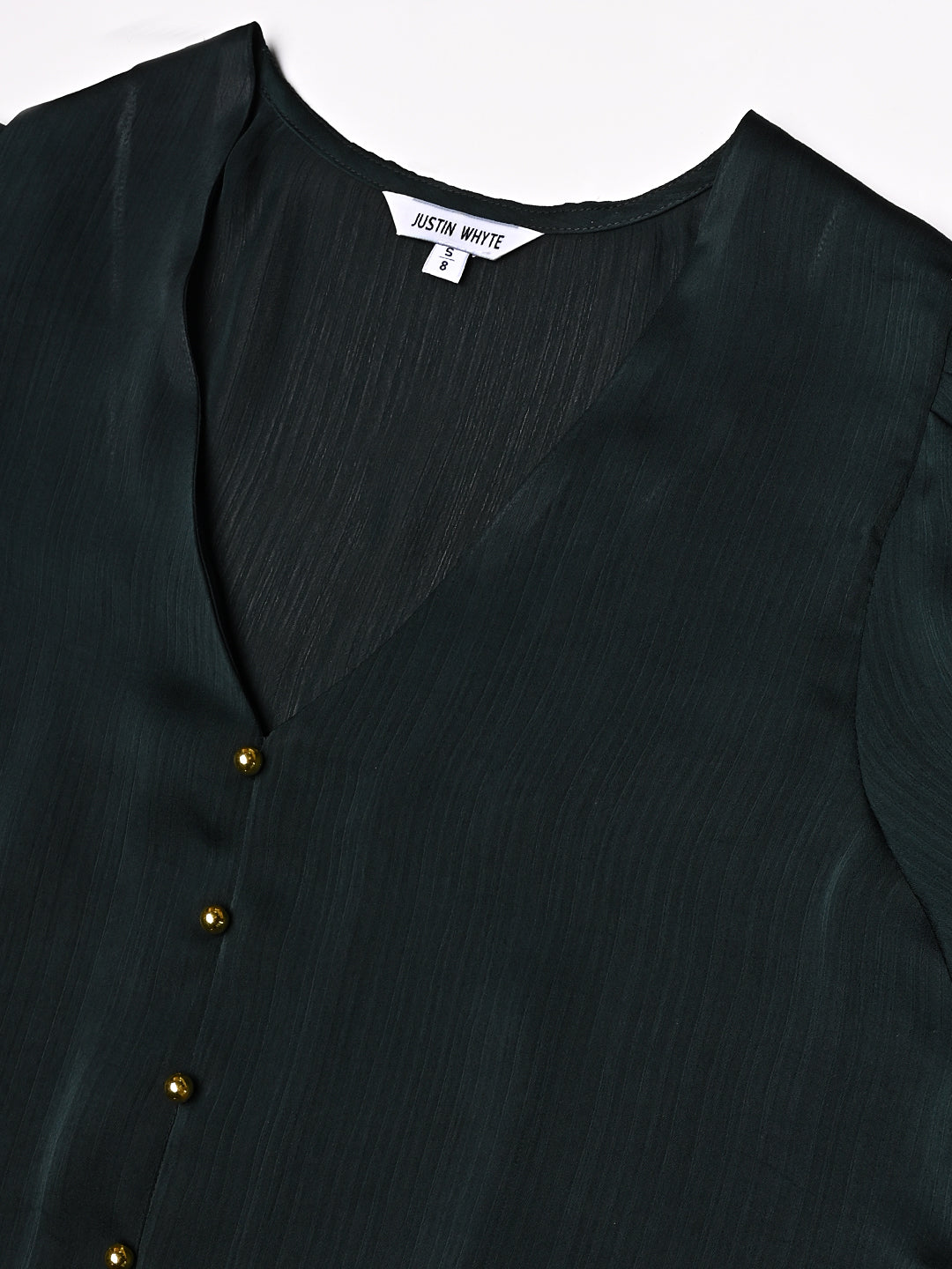 This elegant V-neck top features a classic front-button design with puff sleeves, perfect for both workdays and casual evenings.
