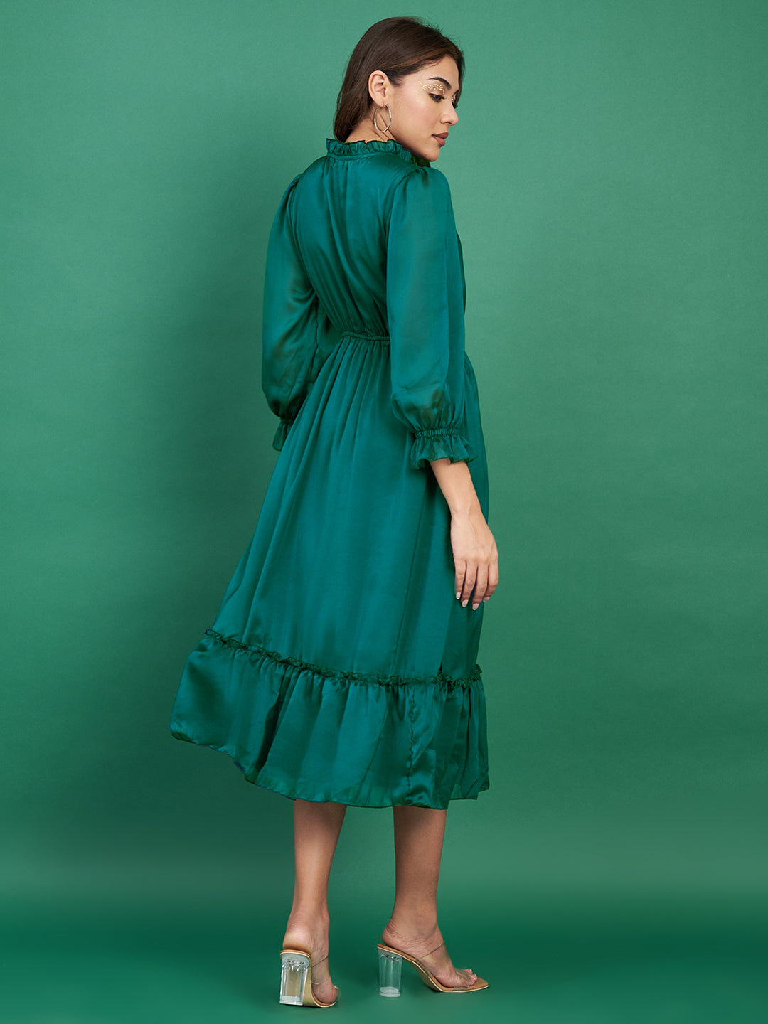 A sophisticated emerald green midi dress featuring a flowy silhouette and romantic ruffle accents, ideal for both formal and semi-formal occasions.