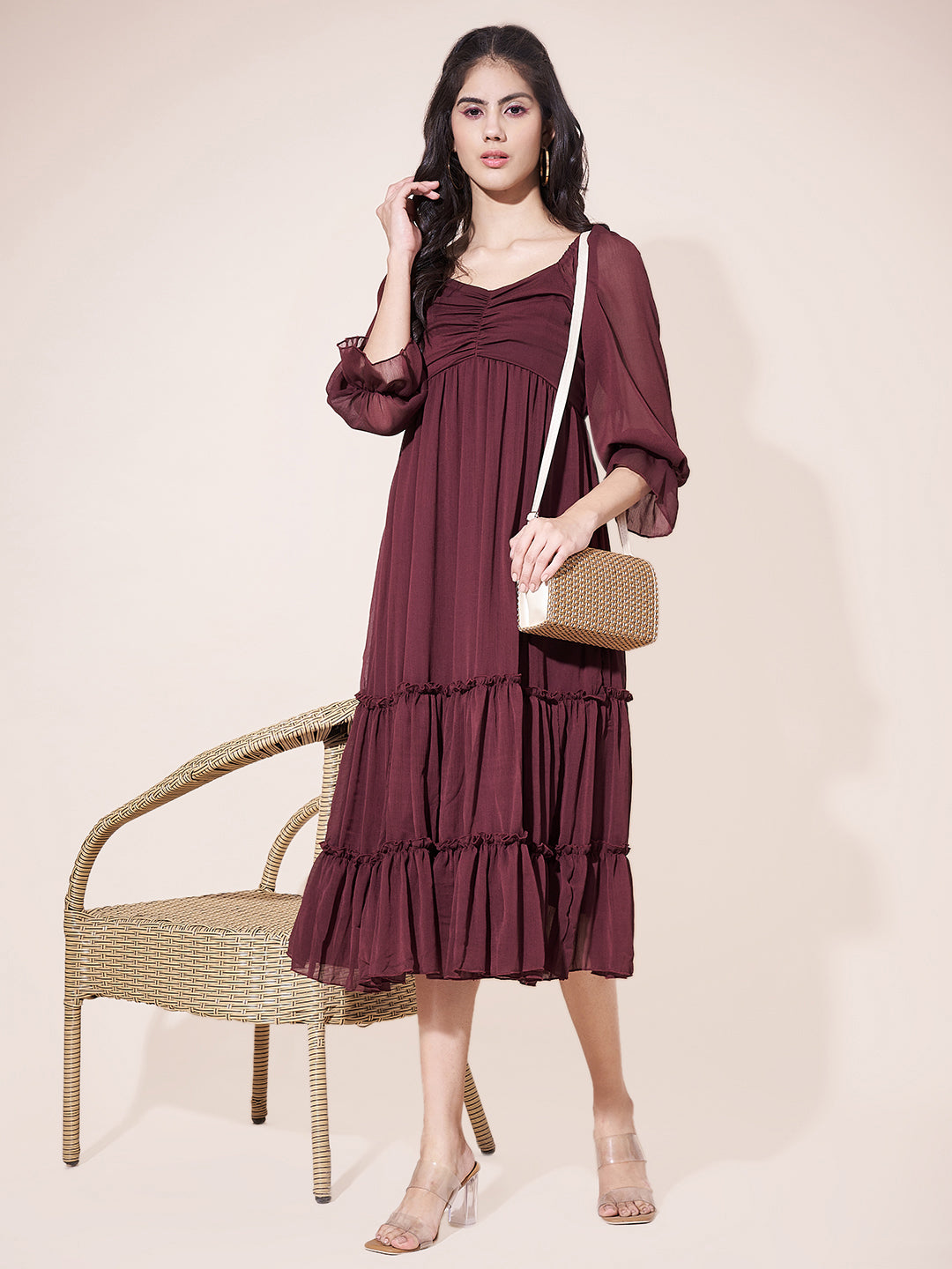 Chic and easygoing, this maroon chiffon dress features soft ruffles, puff sleeves, and a dreamy, tiered silhouette — a versatile pick for relaxed yet stylish daywear.