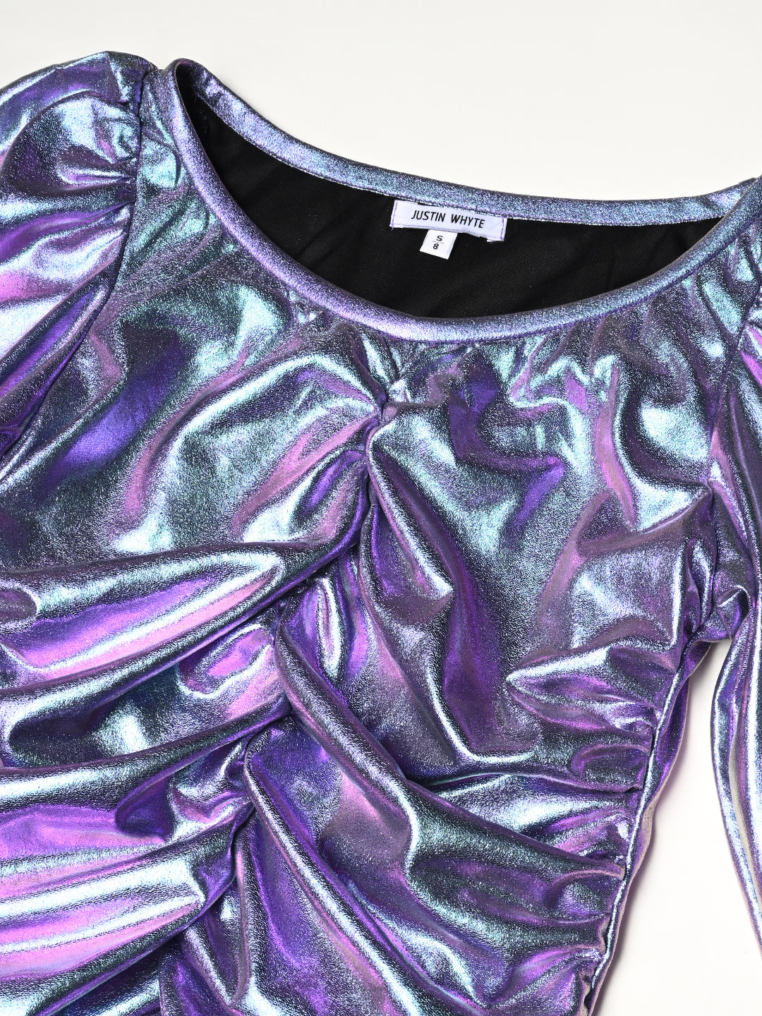Fabric: Metallic stretch fabric (likely polyester-spandex blend) with holographic sheen