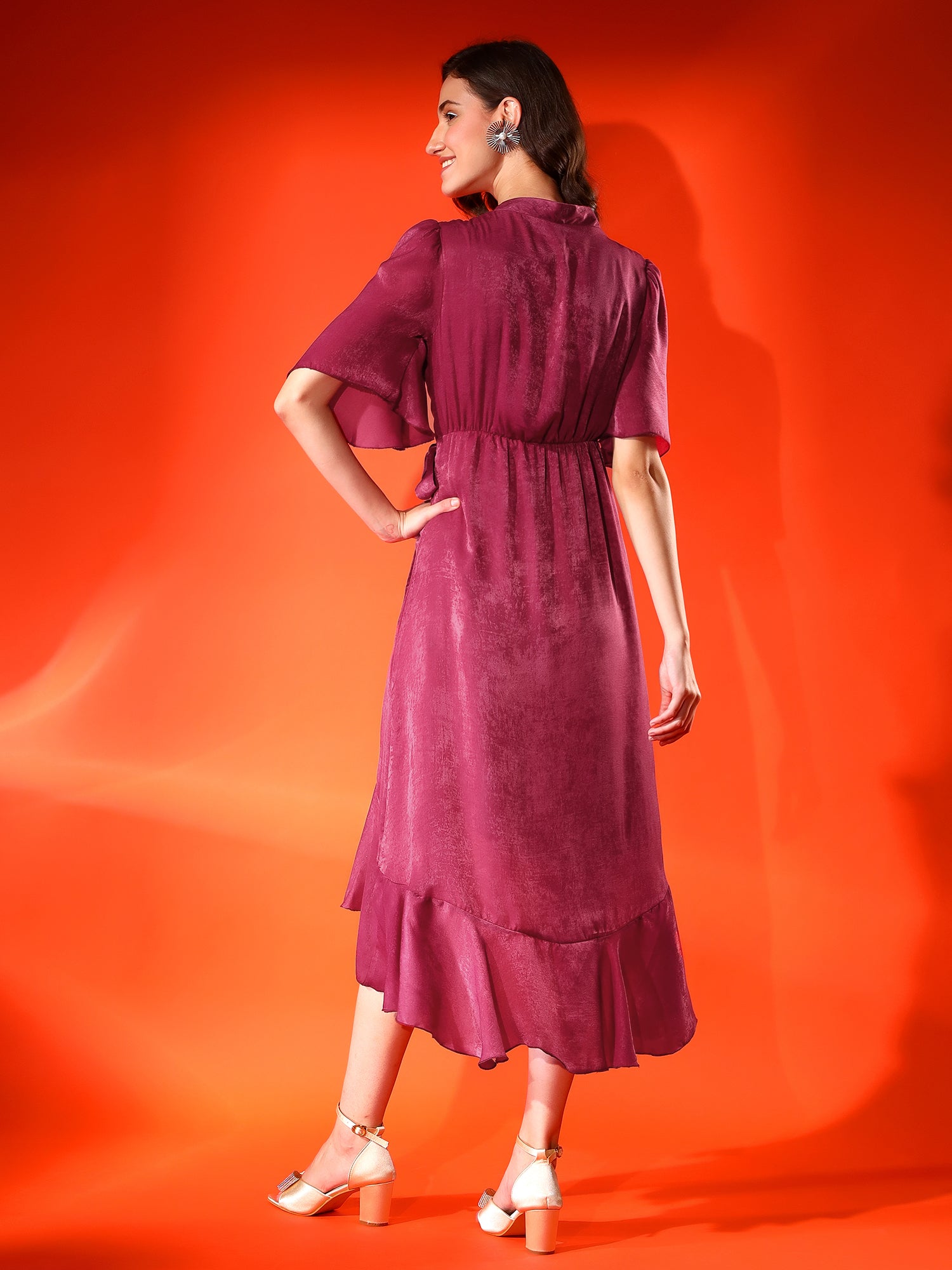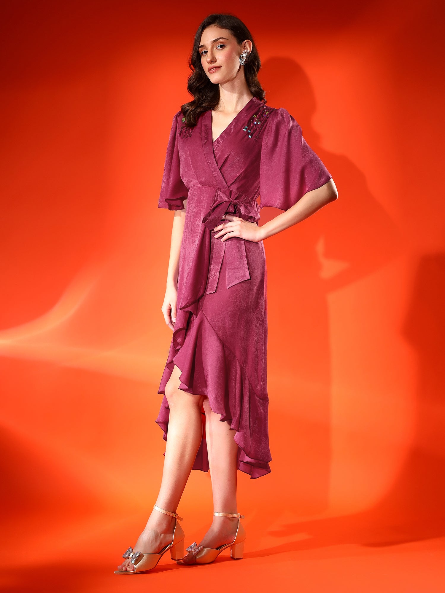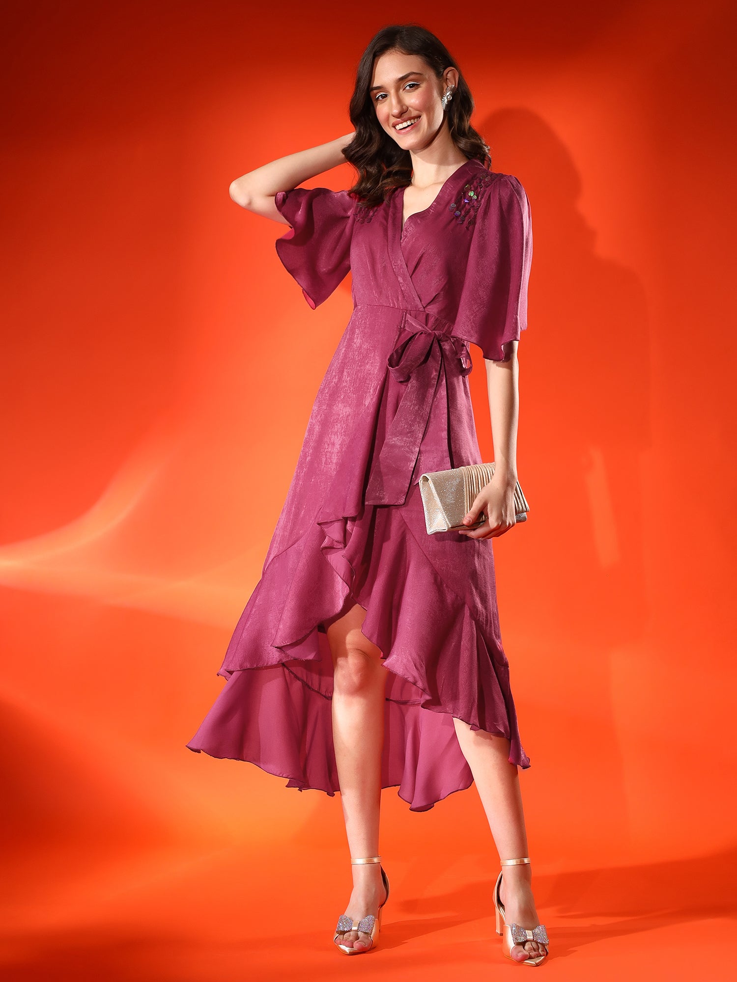 A romantic high-low wrap dress in a rich wine hue, featuring flutter sleeves, shoulder embellishments, and a flowing layered hem—ideal for turning heads at your next event.