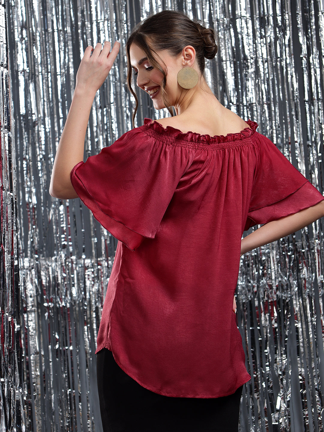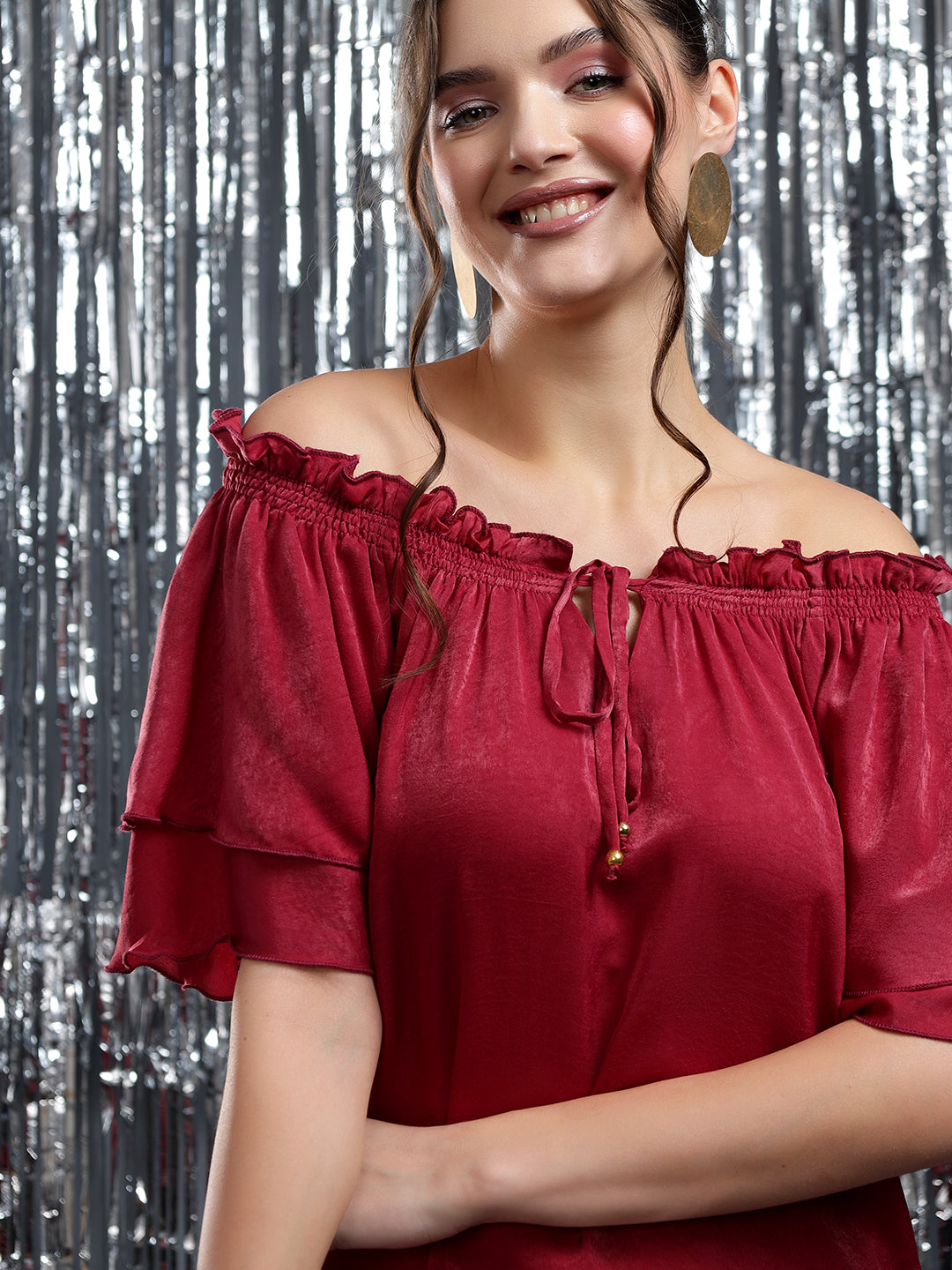 Turn heads effortlessly in this elegant off-shoulder red top, featuring flared layered sleeves and a soft satin finish. The ruffled neckline with a chic tie-up detail adds a flirty touch, making it perfect for brunches, date nights, or festive evenings. Pair it with fitted pants or a skirt for an effortlessly graceful look.