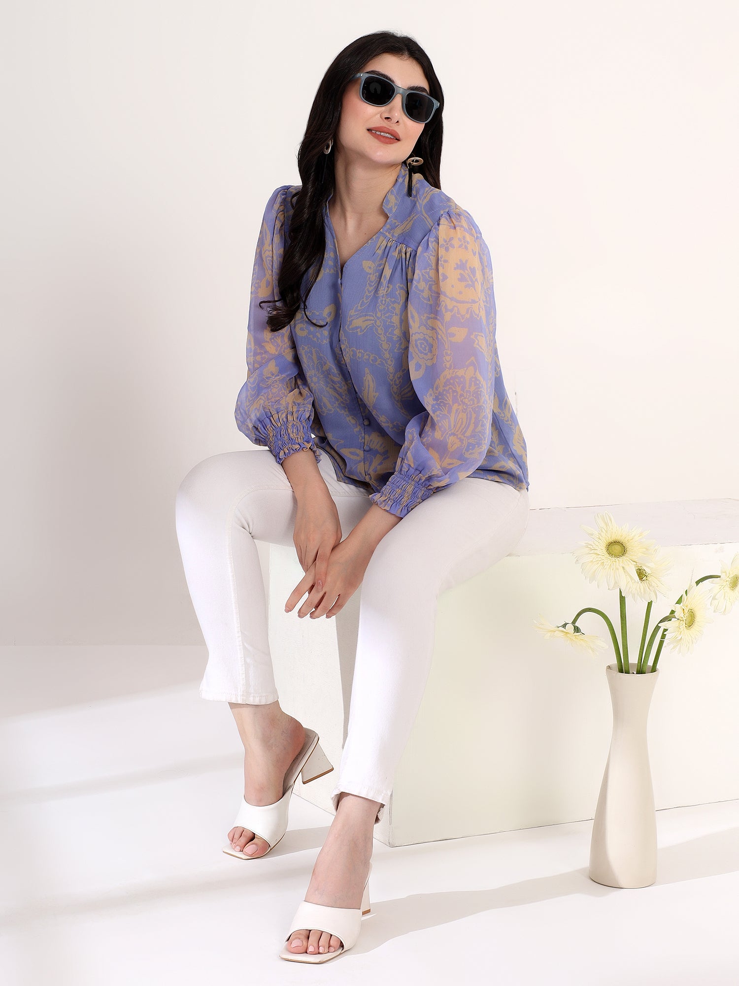 Sheer floral printed lavender top with statement balloon sleeves and button detailing, perfect for casual chic and semi-formal looks.