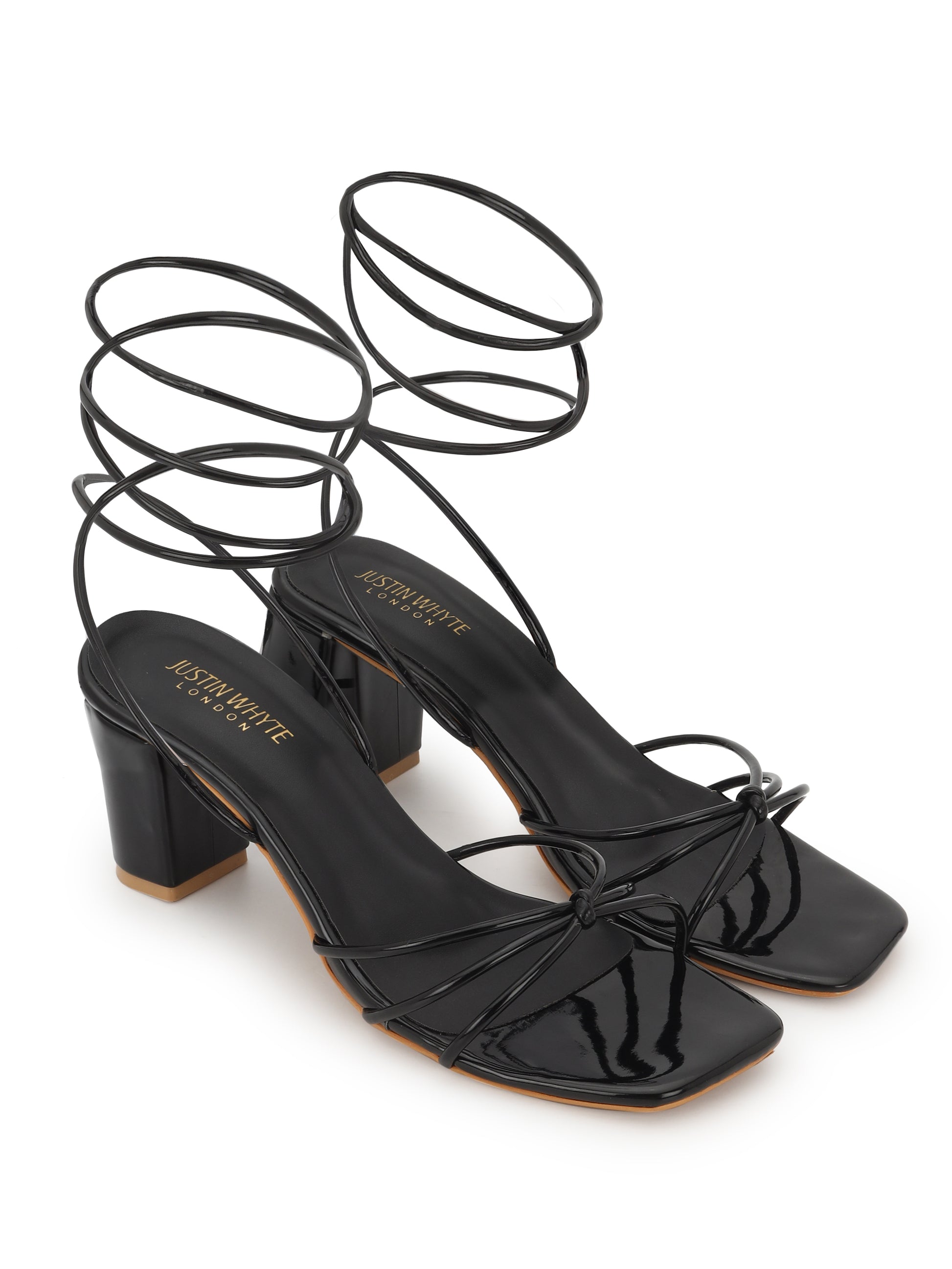 Elevate your evening look with these glossy black lace-up heels. Featuring a sleek square toe, strappy upper, and bold wrap-around laces, these sandals are made to steal the spotlight.
