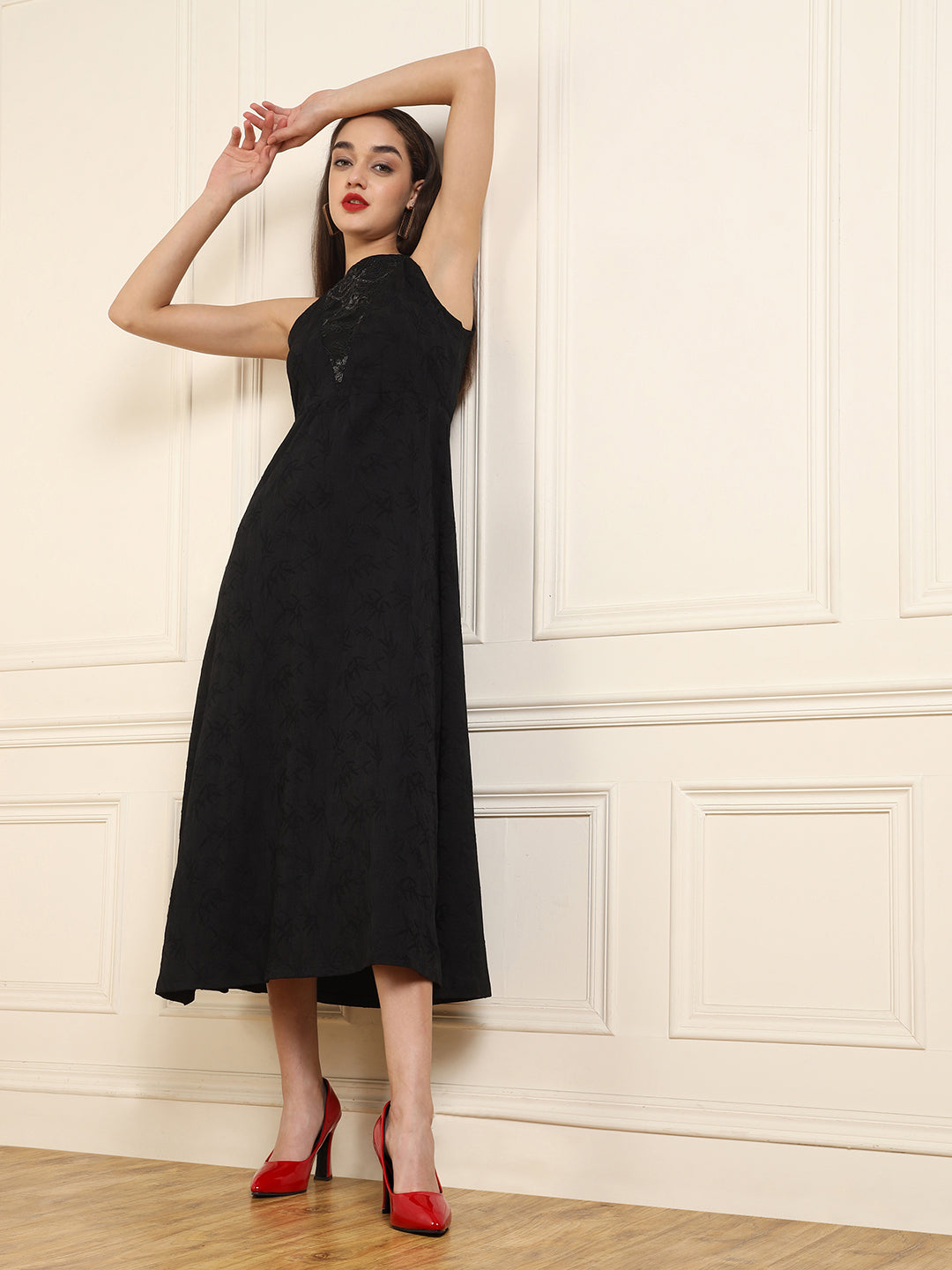 - Glossy red pointed-toe pumps with sculpted high heels